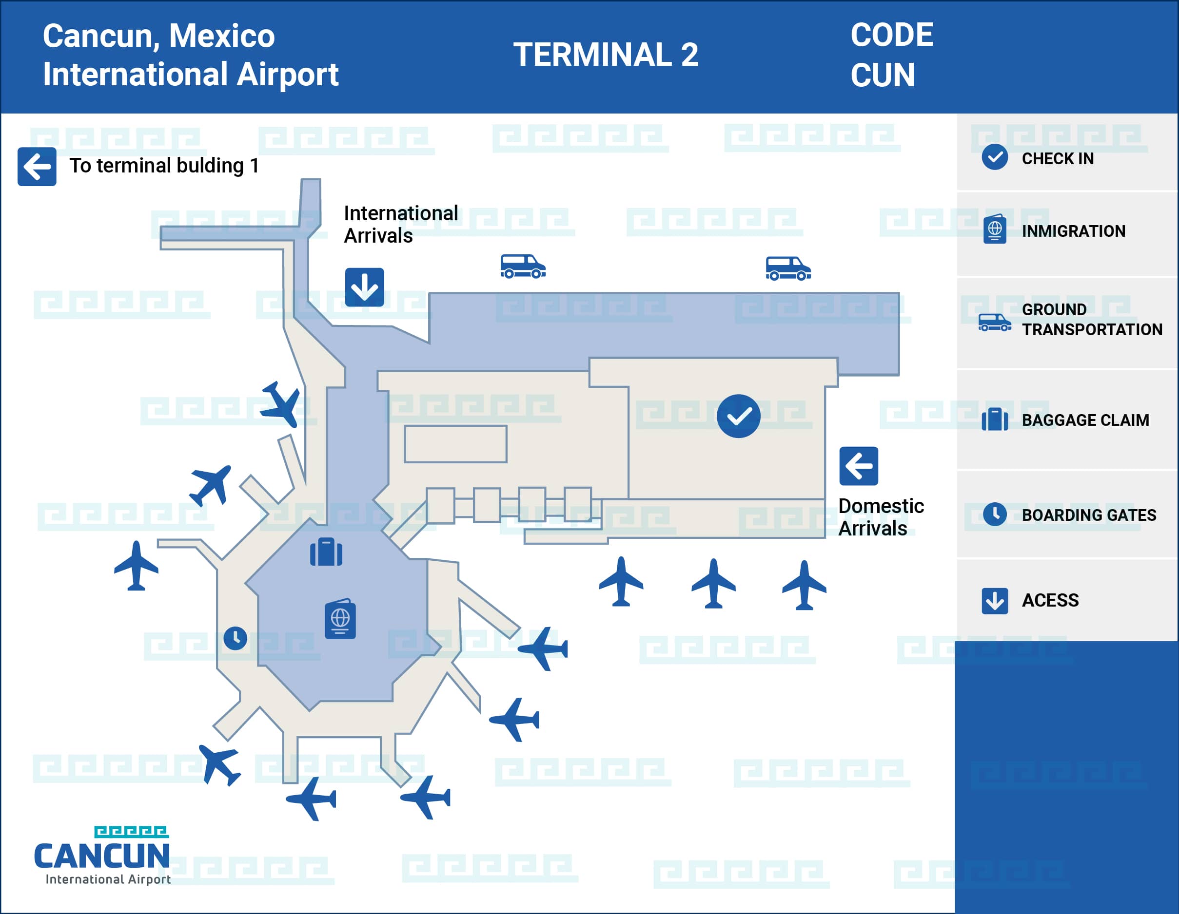 Conoce las entradas y salidas de las terminales 2, 3 y 4 del Aeropuerto de Cancún (CUN). Consulta donde se encuentra ubicado el estacionamiento, las entradas a las terminales así como la ubicación de las salas de equipaje, migración, abordaje y llegada del Aeropuerto en el Mapa del Aeropuerto de Cancún. El Aeropuerto cuenta con 4 terminales, siendo 3 las principales (Terminal 2, 3 y 4), ya que la terminal 1 se usa en su mayoría para vuelos chárter. La terminal 2 principalmente para vuelos nacionales , mientras que las terminales 3 y 4 para vuelos internacionales.
